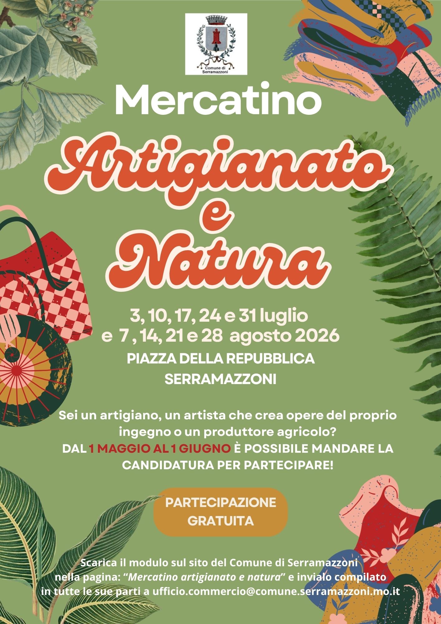 Scarica il modulo che trovi anche qui in allegato, compilalo e firmalo in tutte le sue parti (allega documento di identità in corso di validità e foto dei prodotti che intendi portare) e invialo via mail a ufficio.commercio@comune.serramazzoni.mo.it.